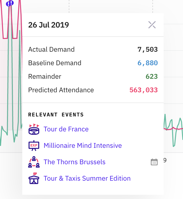 This shows you the Actual Demand, Baseline Demand, Remainder and Predicted Attendance as well as relevant events and their category on a given day.