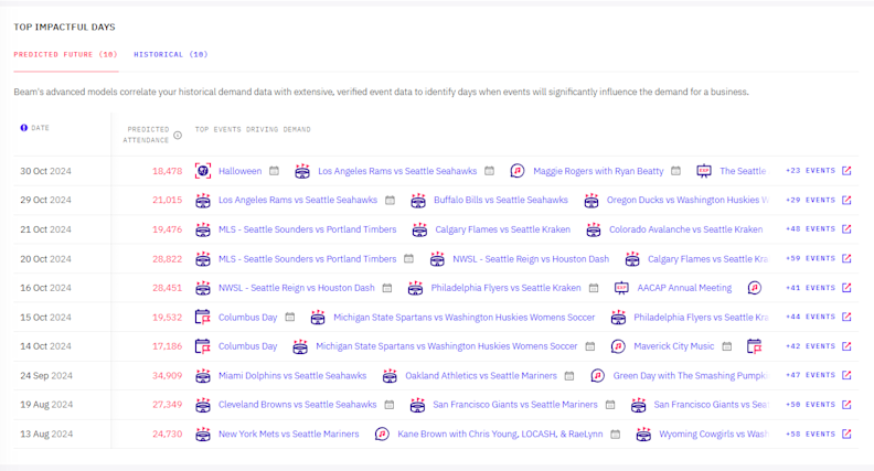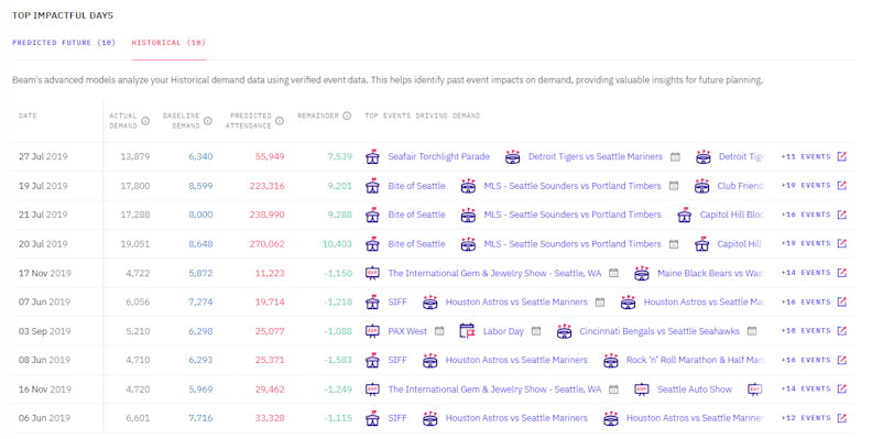 Beam's advanced models correlate your historical demand data with extensive, verified event data to identify days when events will significantly influence the demand for a business. This tab shows future events that are predicted to impact your demand.