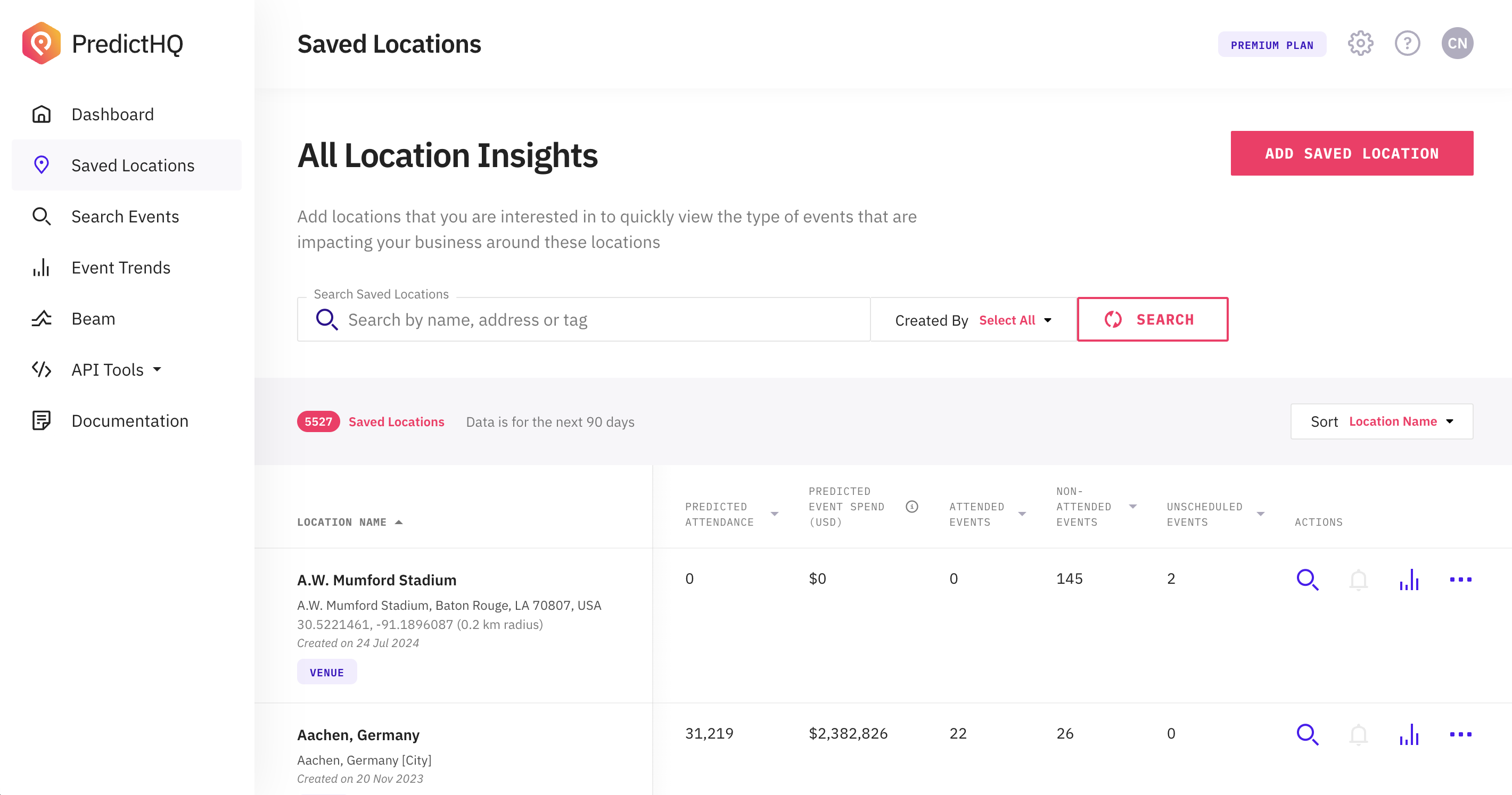 The location insights table shows you all the key details for each location including the address, latitude and longitude, the radius, who created it, and when it was created. The table also shows data for each location over the next 90 days (See [what-do-each-of-the-columns-mean](https://docs.predicthq.com/webapp-support/location-insights/what-do-each-of-the-columns-mean "mention") for more details).