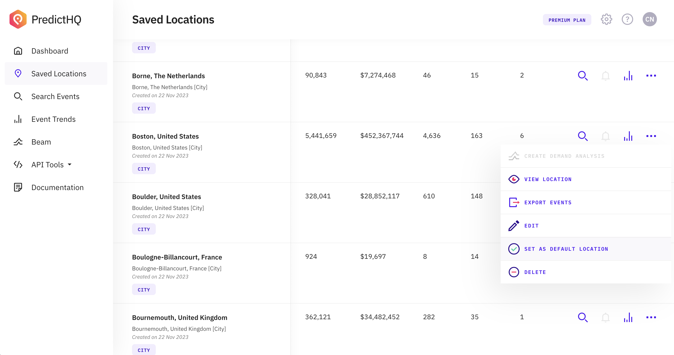 This will set the default location for [Search Events](https://docs.predicthq.com/webapp-support/webapp-overview/events-search) and [Event Trends](https://docs.predicthq.com/webapp-support/tools/see-event-trends-in-the-webapp) so when you use those features the location control will be set to the location you have selected as your default. This setting is remembered per user (it is stored locally so you will need to set it on each device you use).