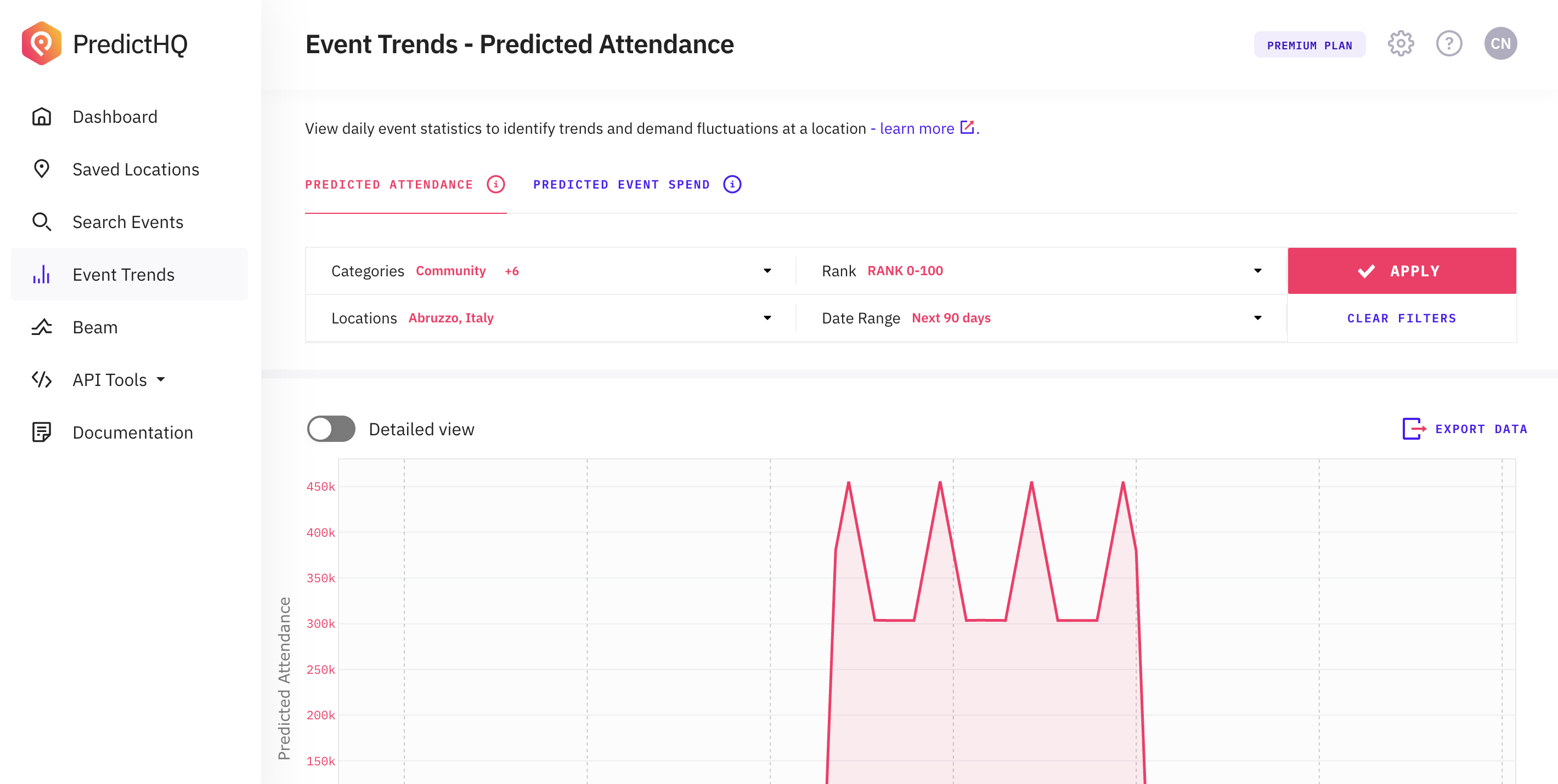 Event trends shows you what's happening at your location in the next 90 days by default, but you can change this by changing the date range. The dotted line on the graph shows the average attendance. In this graph, you can easily see any days with demand surges and any days with below-average demand.