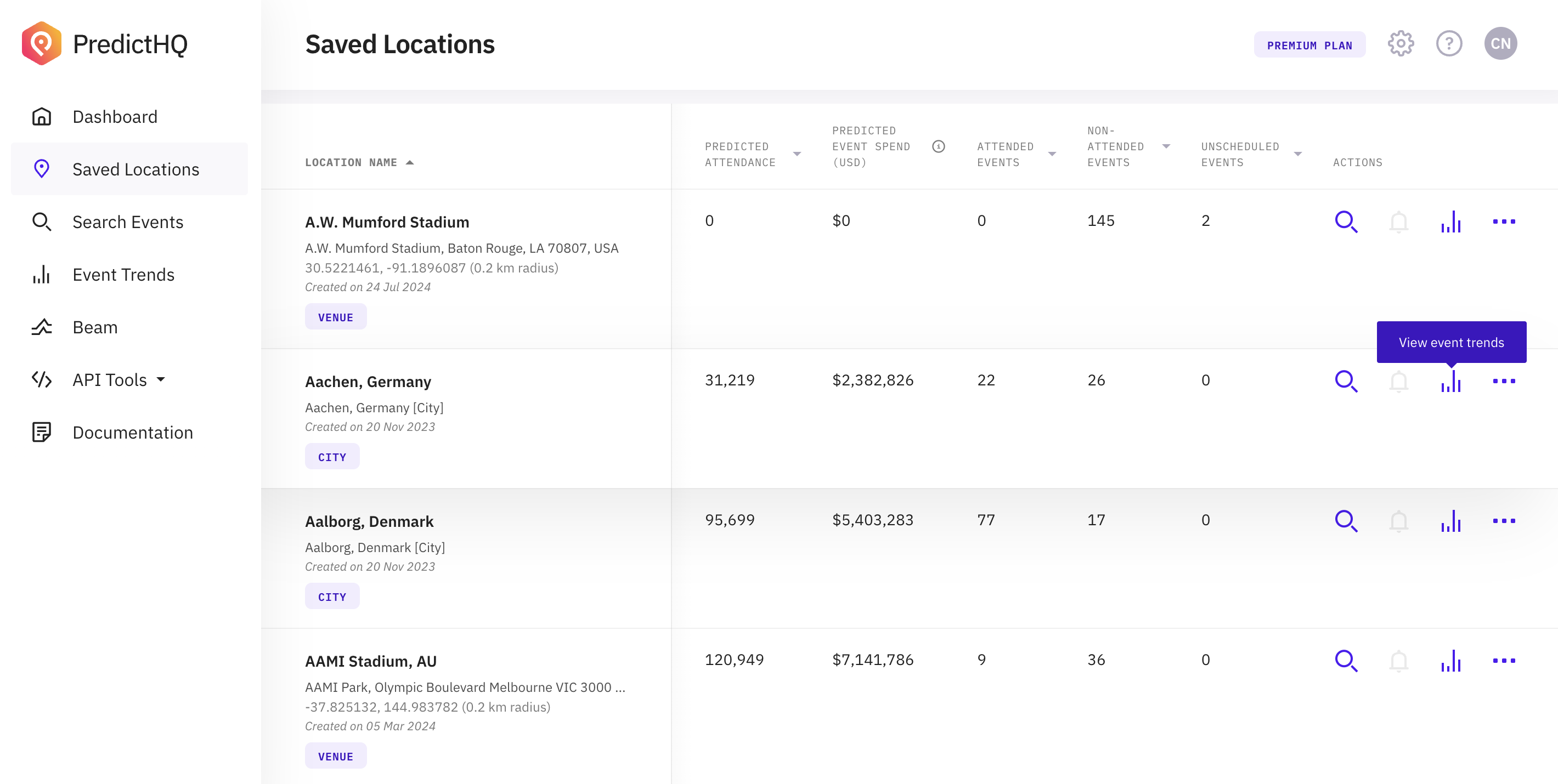 In the All Location Insights list, select one of your saved locations and click on its View Event Impact icon to see the event trends for that location. The daily event impact shows the total amount of people attending events per day at the specified location. When you choose View Event Impact for a **Center Point & Radius** location, the "within" field will be populated with the latitude, longitude, and radius of the location.